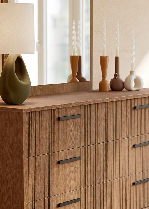 The Ritmo Dresser showcases light eco oak wood with a distinct alternating striped and smooth surface. This interplay of textures creates a subtle ...